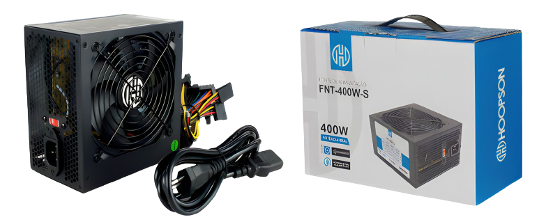 Potência: 400 Watt | Frequência: 50-60Hz, Tipo: ATX, Voltagem entrada: 115v/230v, Ventilador: 8cm, Temperatura de trabalho: 5°c – 50°c, Conector MB ATX (24 pinos): 01, Conector ATX 12v (4 pinos): 01, Conector SATA: 02, Conector IDE: 02.